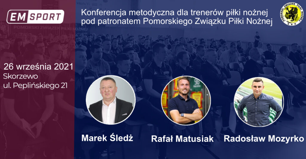Rozpoczynamy zapisy dla trenerów i animatorów piłki nożnej na konferencję metodyczną, która odbędzie w dniu 26 września 2021 roku się w miejscowości Skorzewo koło Kościerzyny. Prelegentami będą trenerzy Marek Śledź, Rafał Matusiak i Radosław Mozyrko.